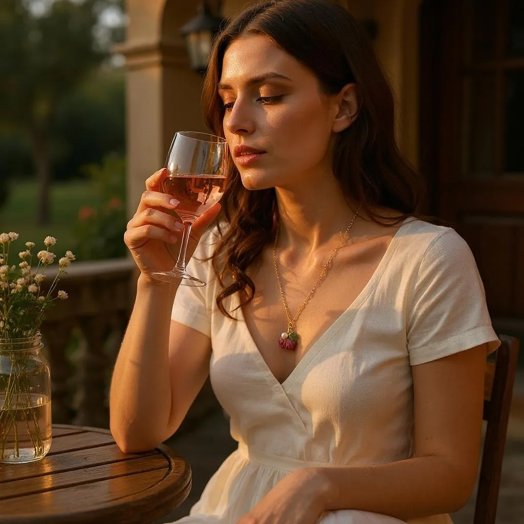 This minimal pendant necklace features three delicate charms: a magenta ginkgo glass leaf with golden touches, a faux pearl and a small lime green resin teardrop. Suspended on a golden paperclip chain, it adds a charming and subtle detail to your outfit.
