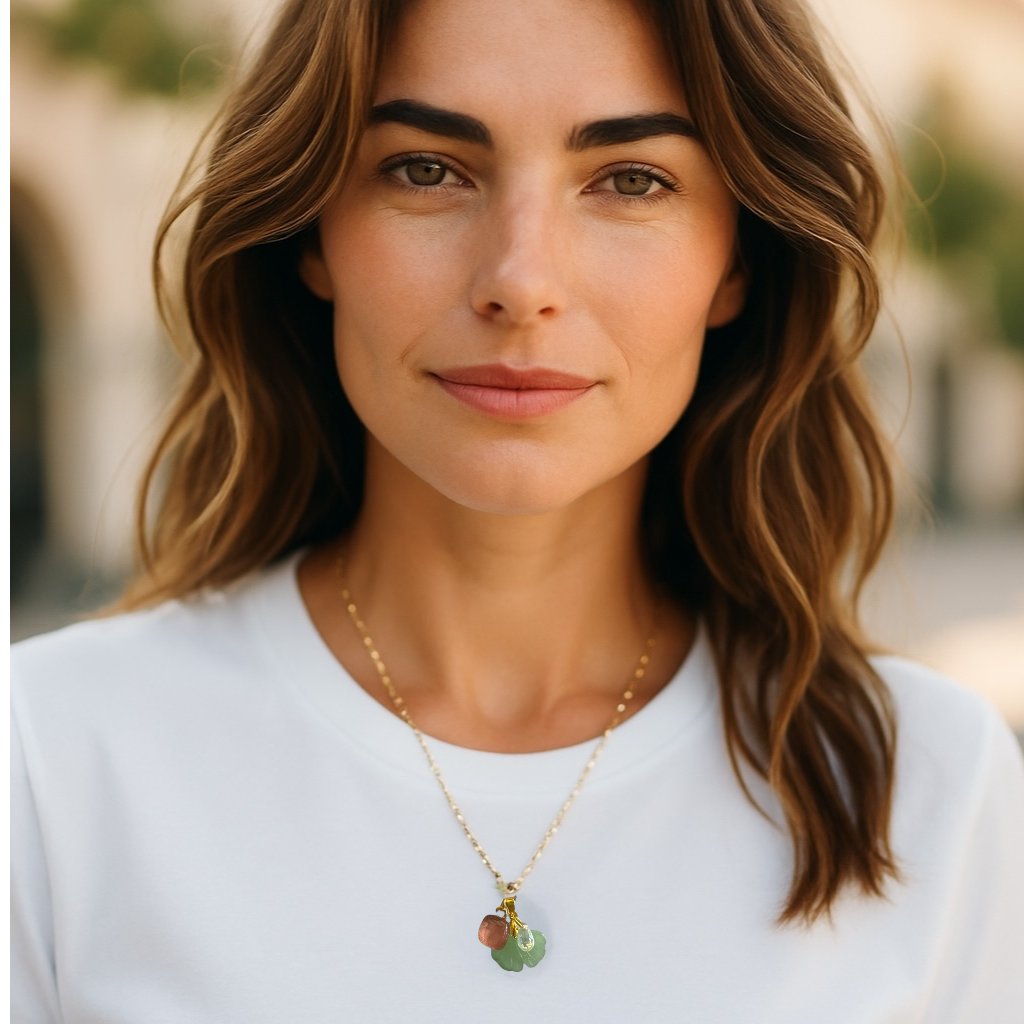 This graceful pendant necklace features three delicate glass charms: a ginkgo glass leaf, a bohemian glass teardrop, and a small glass square with rounded edges, in soft pale green, cristal clear and pink shades. Suspended on a golden paper clip chain, it adds a charming and subtle detail to your outfit.