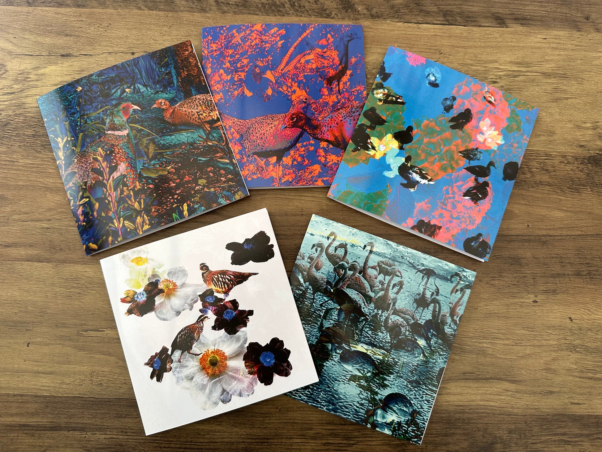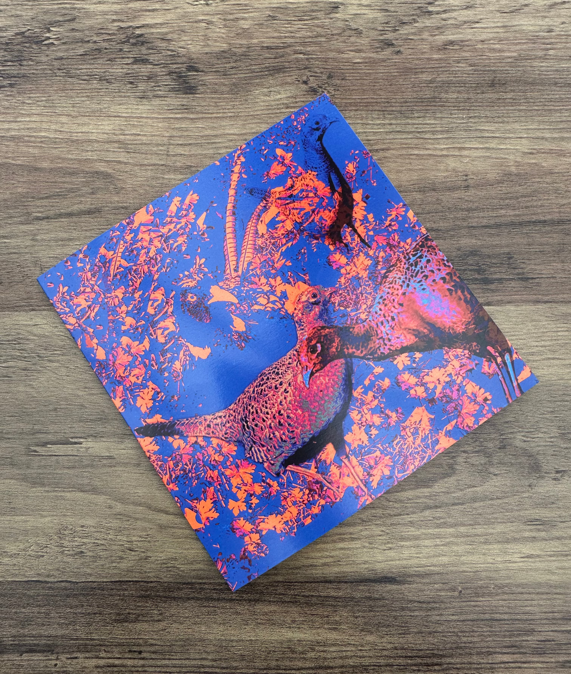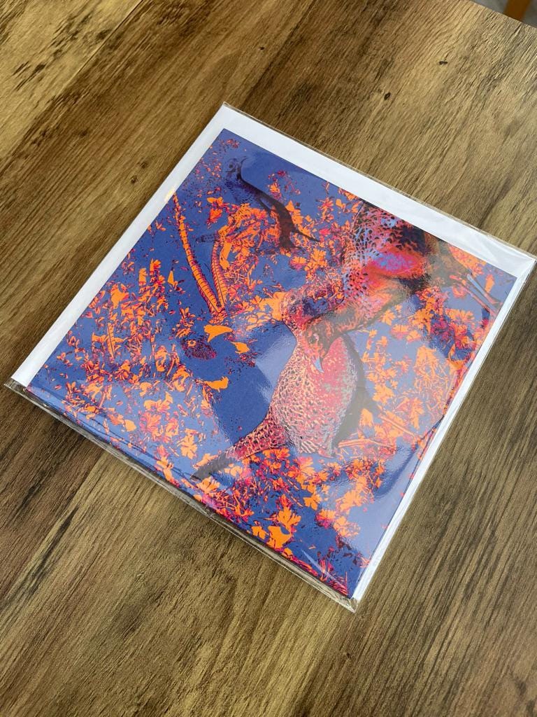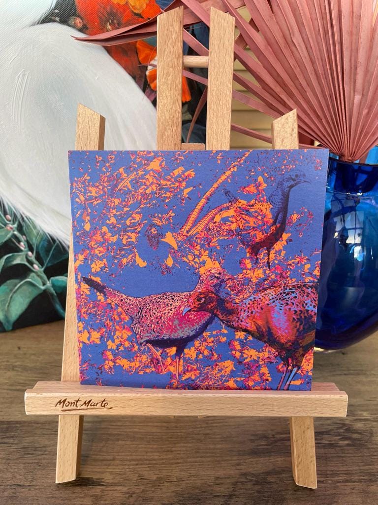 This card is part of 'My Feathered Friends' Collection and portrays a cock pheasant with his harem of hens. Here, protrayed in unsual striking shades of blue, pink and orange, they create a charming scene of countryside life. Have you ever observed them during their mating season? They are quite fascinating to watch. Pheasants are such fast runners sometimes I wonder if they forget they can fly! Watching them dash through fields and hedgerows with surprising speed is one of the delights of rural walks.