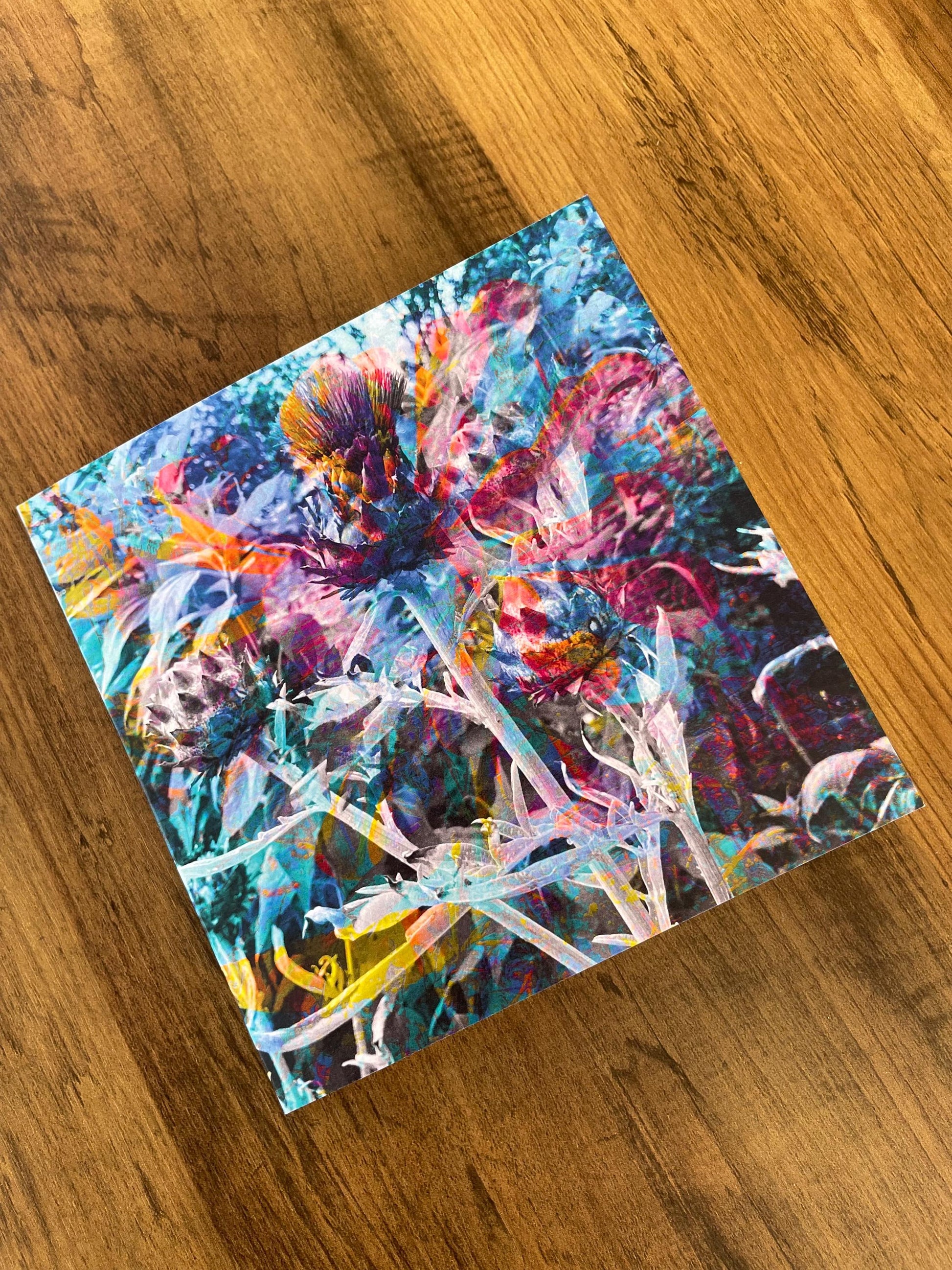 Scotland's national emblem, the thistle, is a symbol of resilience, strength, and pride—a hardy plant that flourishes even in the harshest conditions. With its vibrant purple blooms and distinctive spiky leaves set against a rich, earthy background, this card captures the untamed spirit of the Scottish landscape.
