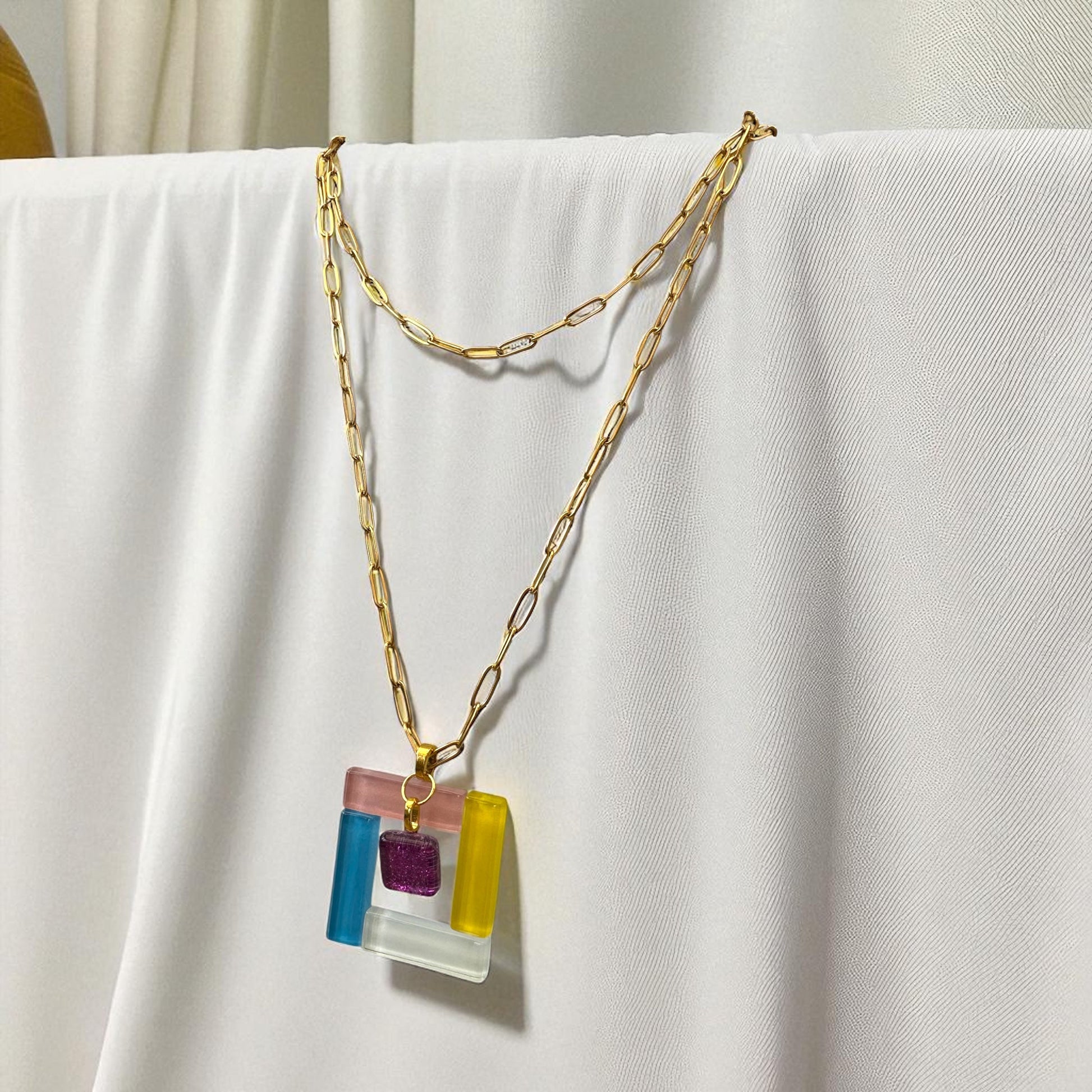 This geometrical fused glass pendant necklace adapts to your style—whether worn short, at full length, or layered with a double chain, its versatile design offers plenty of options for expressing your uniqueness. The double lobster claw clasps make changing styles easy and convenient.