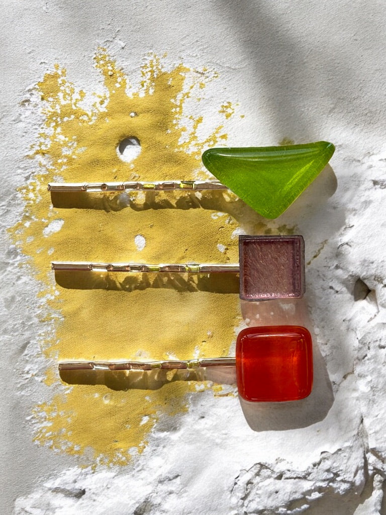 Glass Hair Pin Set, in Green, Purple & Red Orange