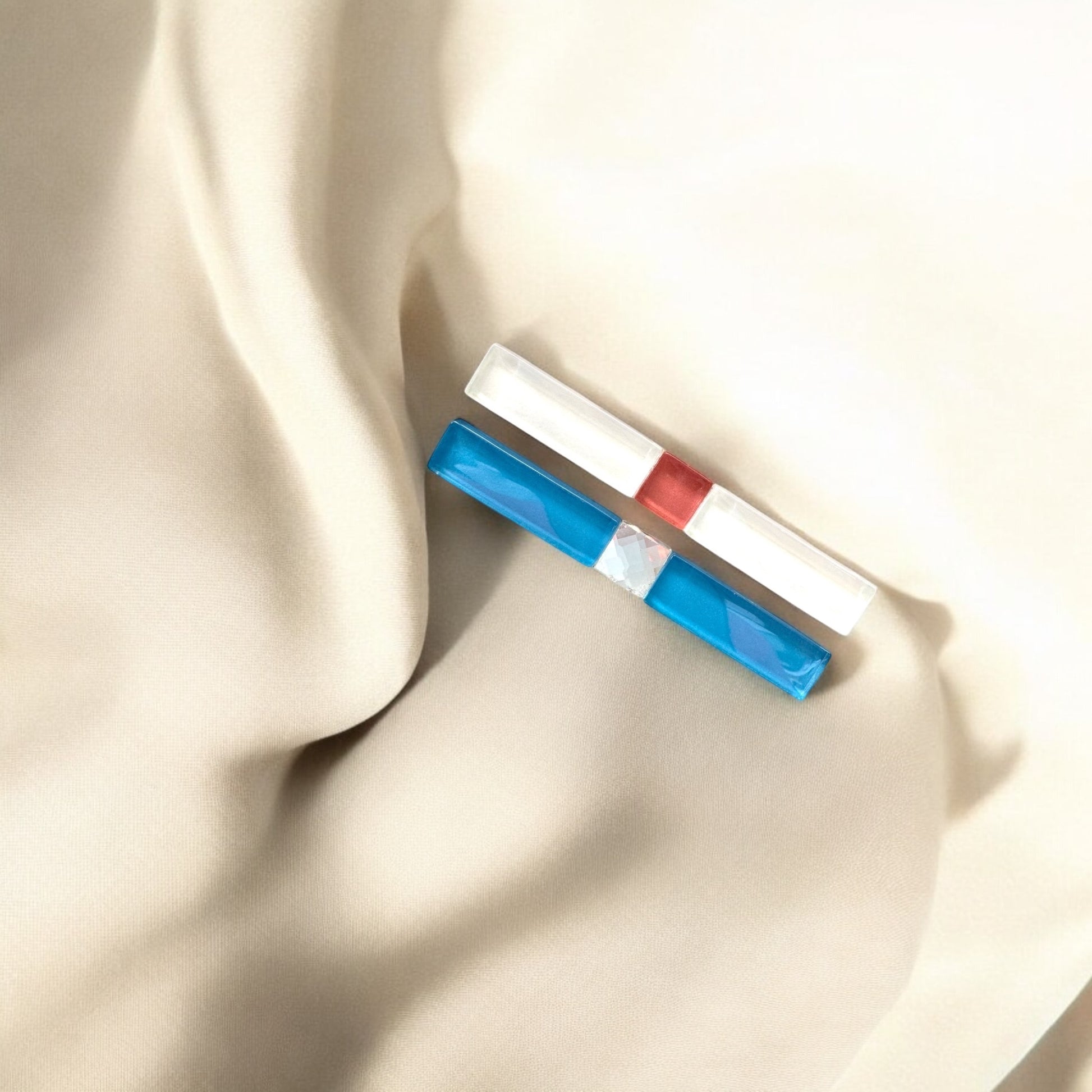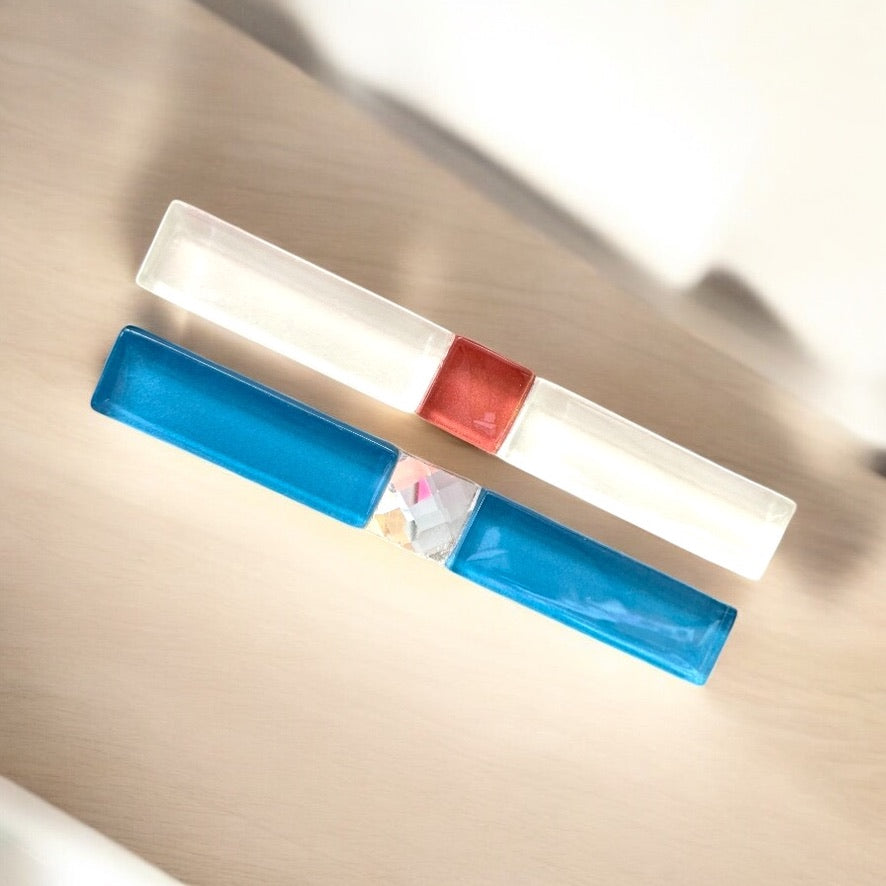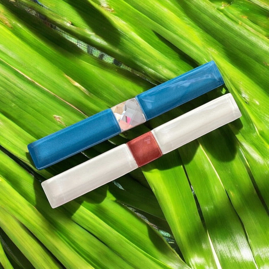 Add a burst of color to your hairstyle with this set of two long glass bar clips in vibrant blue and crisp white. Wear them together or separately for versatile styling.