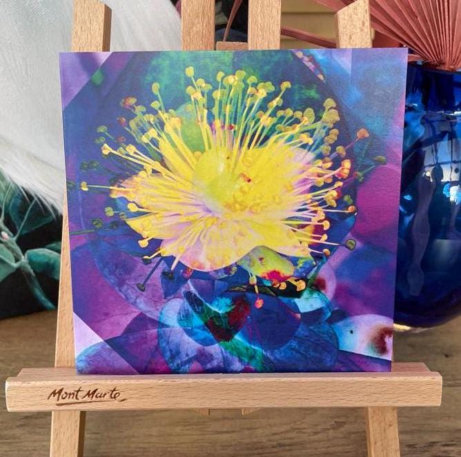 The vivid yellow blooms of St. John's-wort stand out beautifully against the rich purple and blue background, creating a bold and uplifting design. Known for centuries as a healing herb, St. John's-wort carries with it a sense of warmth and wellbeing, making this card perfect for sending messages of comfort, encouragement, or simply sharing a moment of natural beauty.