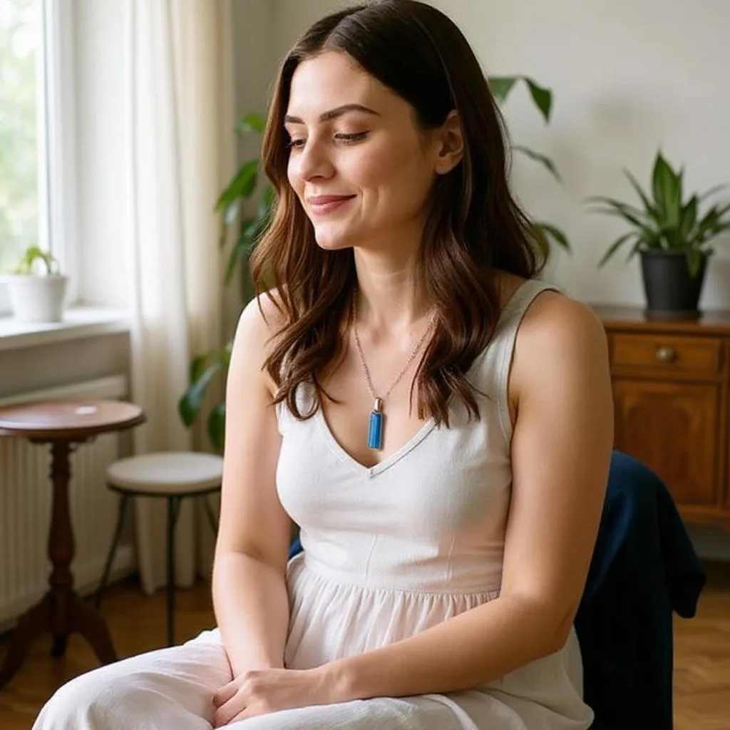 This bar-shaped pendant stands out with its simple design and vibrant blue glass element in two different shades. Set on a sleek, smooth silver-finished bail, it that adds a refined touch to your outfit. The dainty silvery chain adds personality and an androgynous quality to this necklace.