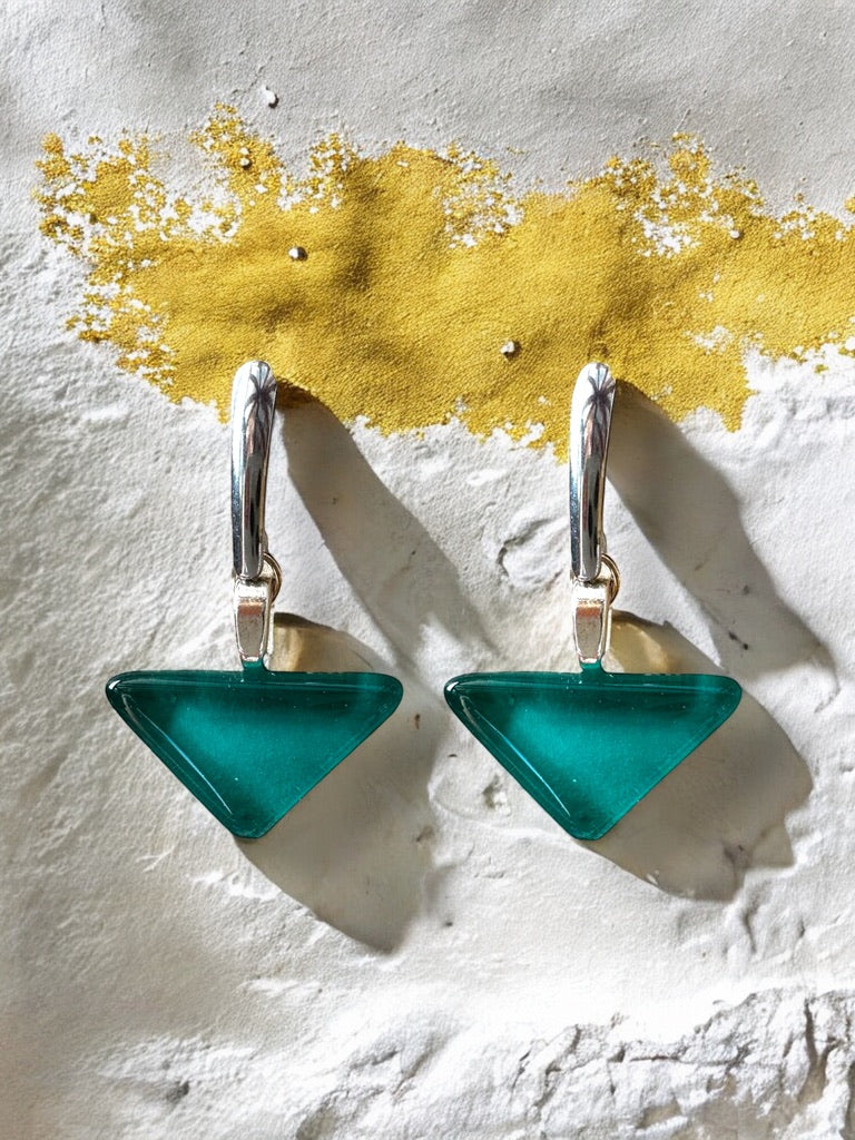 These triangle drop earrings feature a silver finish and vivid green glass, offering a simple yet striking minimalist style. The bar stud design adds a dash of chic, creating a contemporary classic. Explore our selection of green shades: soft aqua, deep blue-green, and luminous shimmering green. Whatever your choice, these pair are a 'go to' essential for trendsetters who love a little edge.