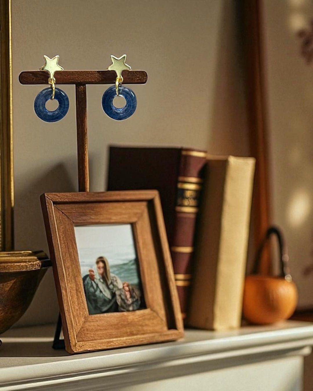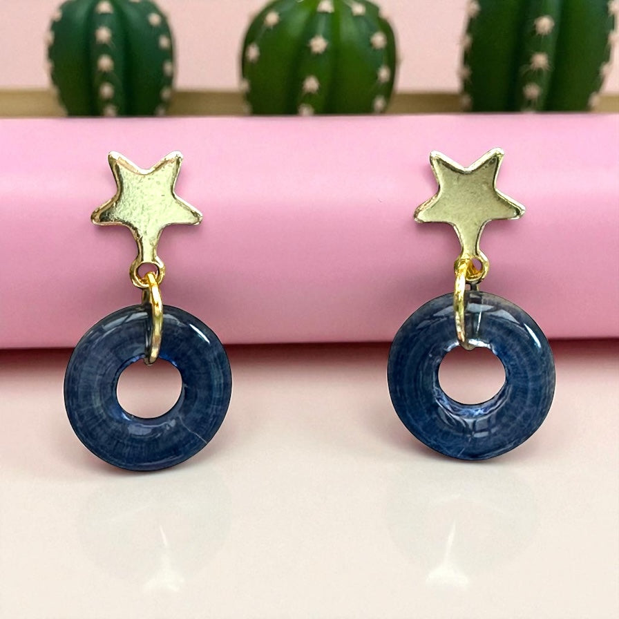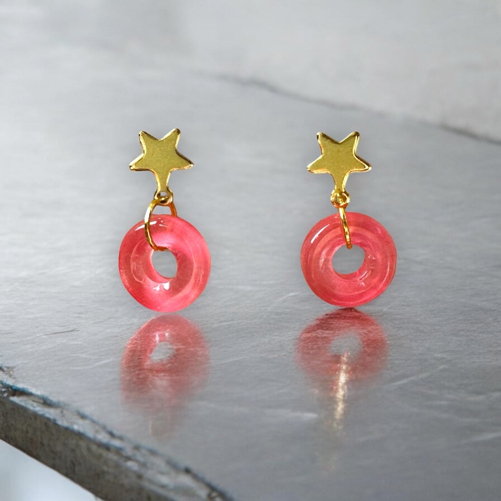These charming ring and star stud earrings pair delicate golden five-pointed stars with glass rings in your choice of vibrant hues. Select from soft pink, watermelon, bold red, or cool blue—each colour brings its own personality to this elegant geometric design.