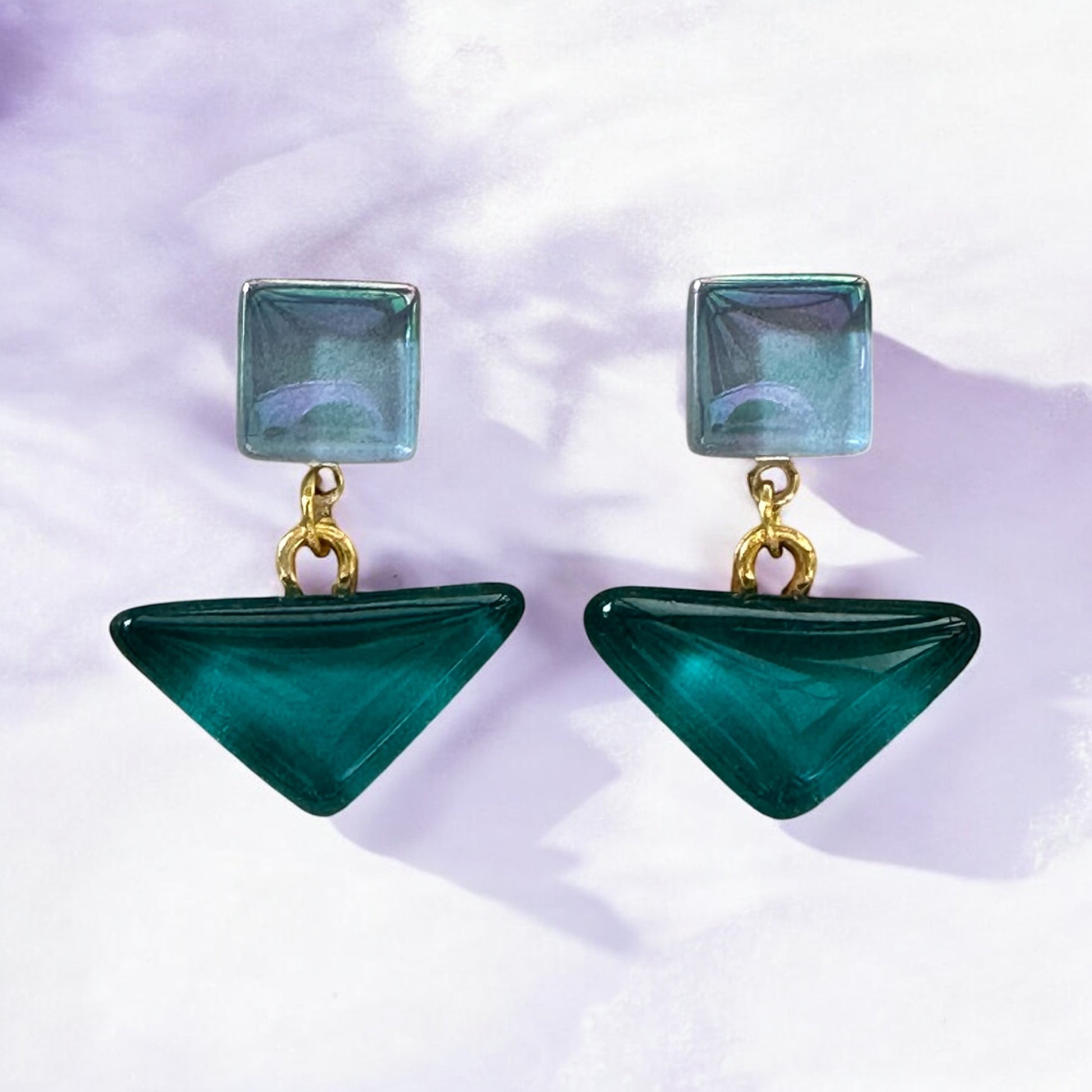 These charming earrings mix pale blue and dark blue-green glass geometrical shapes with a playful dangle and a hint of golden finish, making them your go-to accessory for anything from office hours to after-hours fun. Elegant simplicity to dress up your lovely ears.