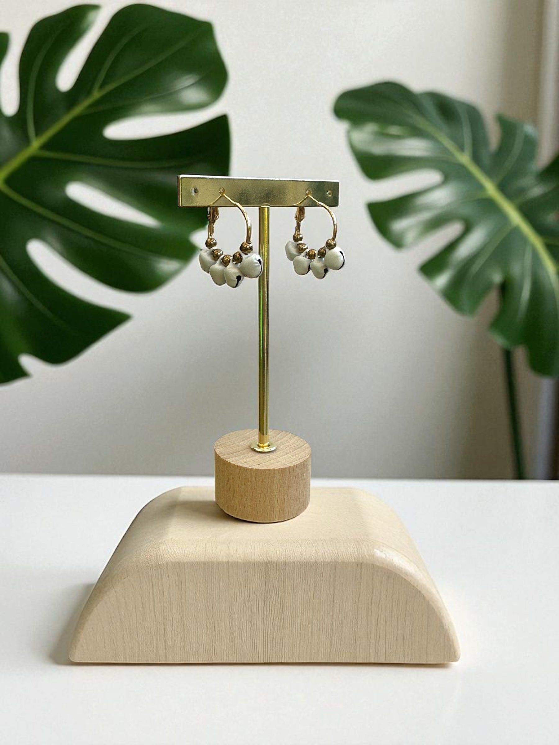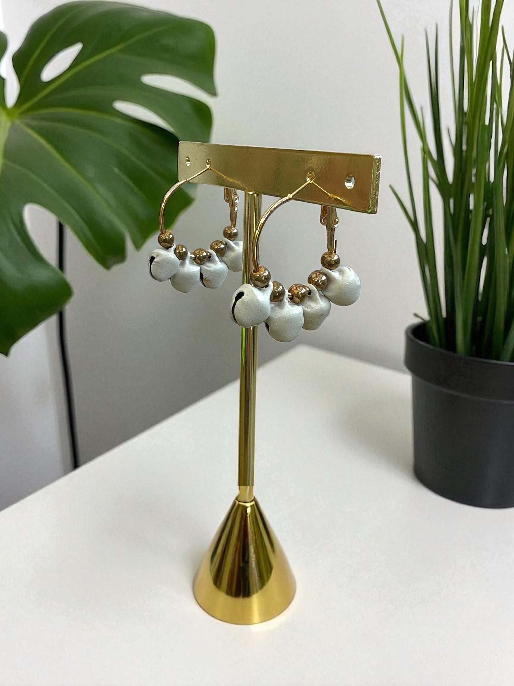 These lightweight golden hoop earrings bring a charming ethnic feel, decorated with small chalk-white metal bells that resemble organic seeds—a gentle jingle with every movement.